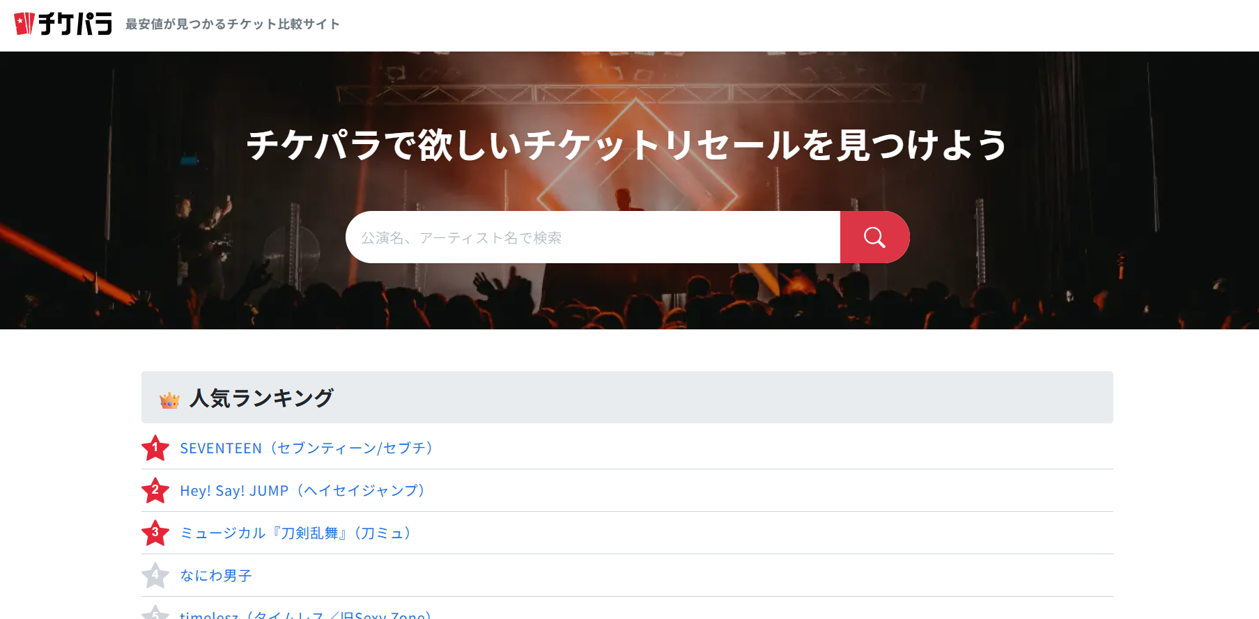 チケパラは、動物園やテーマパークのチケットを最安値で簡単に探せる比較サイトです。チケジャムやチケット流通センターなど複数のリセールチケットサービスから出品情報をまとめて検索できるため、価格や日程の違いも一目で比較可能。