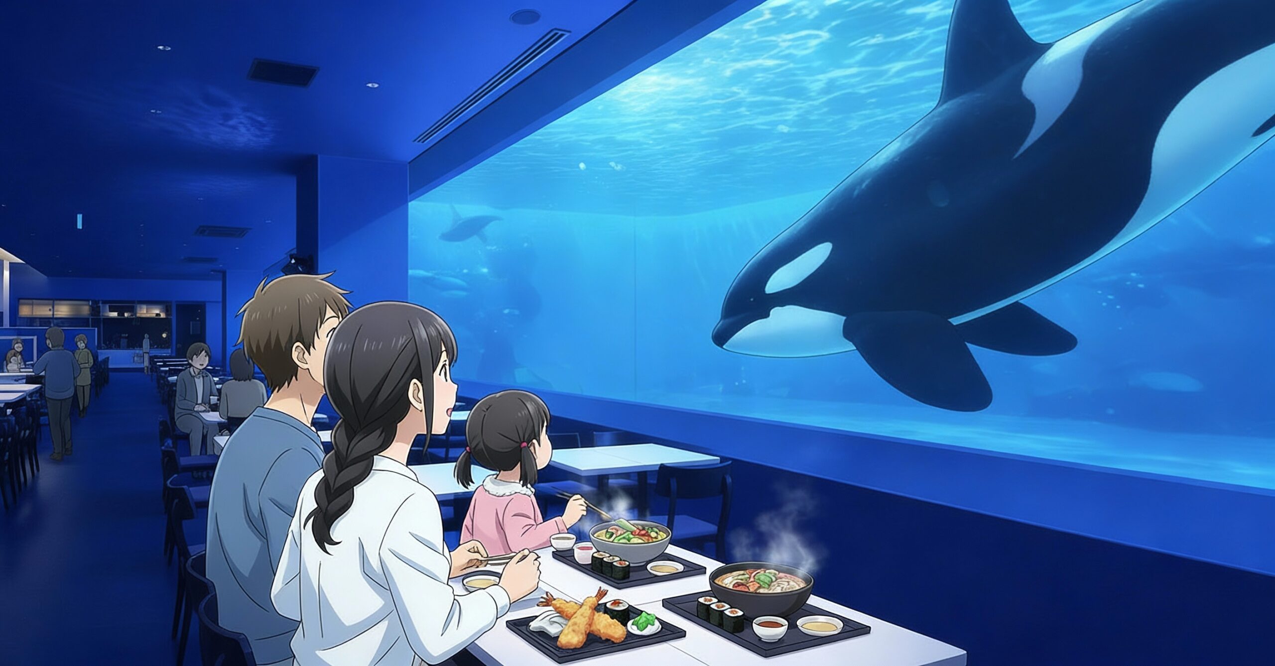 特に窓際の席は競争率が高いですが、どの席からでもシャチの存在感は十分に感じられます。特別な記念日や、旅の思い出作りにこれ以上の場所はありません。
