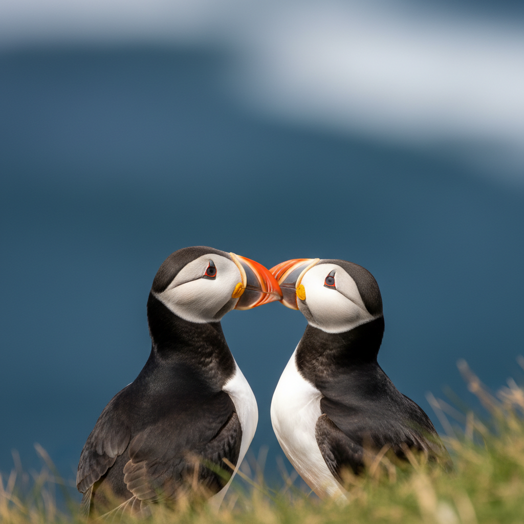 ニシツノメドリの夫婦愛を象徴する行動が、「ビリング(Billing)」と呼ばれる求愛行動です。これは、オスとメスがお互いに顔を近づけ、クチバシを軽く打ち合わせたり、こすり合わせたりする仕草のこと。その様子は、人間がキスをしているように見え、とても微笑ましい光景です。