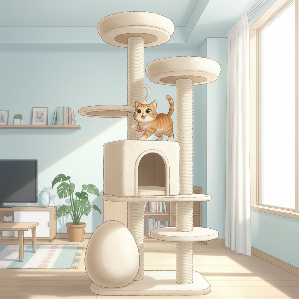 高い場所から部屋を見渡すことは、猫にとって縄張りの監視であり、最高のリラックスタイムでもあります。上下運動ができるキャットタワーは必須ですが、巨大なタワーは部屋を圧迫しがち。