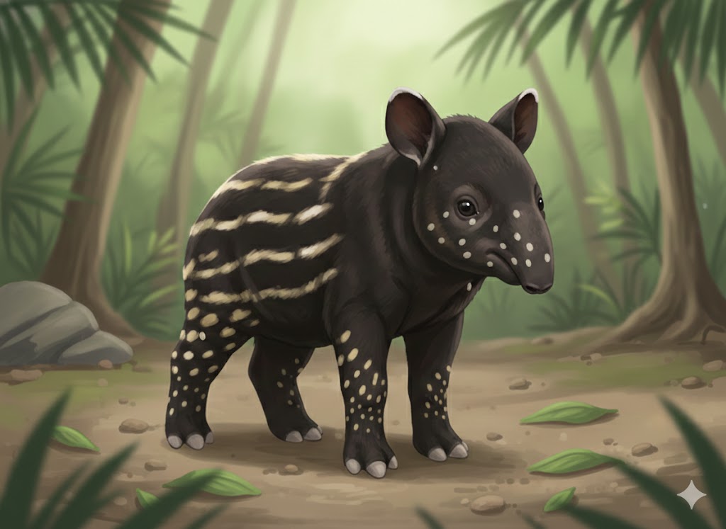 生まれたばかりのバクの赤ちゃんは、茶褐色の体に白い斑点と縞模様がびっしりと入っています。この模様は、一見すると派手で目立ってしまいそうですが、彼らが暮らすジャングルの環境においては最強の「迷彩服(カモフラージュ)」となります。