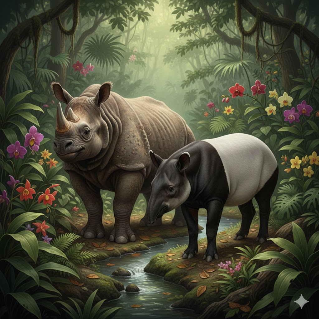 特にバクとサイは、骨格や消化器系の構造が非常によく似ています。例えば、食べた草を消化するために巨大な盲腸を発達させている点などは共通しています。見た目は違っても、体の内部構造やDNAレベルでは、バクとサイは「兄弟」と呼べるほど近い存在なのです。大昔には、バクとサイの共通の祖先が森の中を歩き回っていたことでしょう。